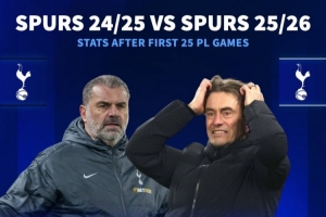 据德国转会市场统计,弗兰克麾下的热刺本赛季英超25轮比赛仅积29分,比上赛季澳波麾下的热刺还少1分。