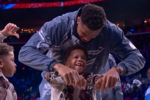 比赛中,伦纳德化身战神卡,字母哥的儿子在场边竖起大拇指为伦纳德加油,作为世界队的一员,字母哥赶紧按下儿子的双手,并教他拇指向下嘘。