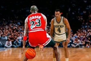 假设你坐在更衣室里,你刚套上一件球衣,看着对手公牛队的录象,一边整理鞋带。教练推门进来,对你说,“今天由你防守……”你最怕听到的名字是什么呢?当教练嘴唇慢慢挤出“迈克尔”这个开头时,你会不会觉得眩晕?