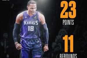 本场比赛,国王球星拉塞尔·威斯布鲁克发挥出色,不仅在三分线外保持着高效,组织端也亮点十足,频频送出妙传,喂得雷诺心花怒放!此外,失误控制方面他也表现的极其出色。