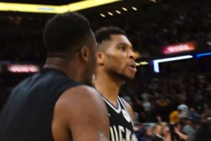 完成绝杀后,字母哥面对客场球迷连续做出拇指向下动作,字母哥哥赶紧上前制止,并用希腊语喊着“冷静冷静”。