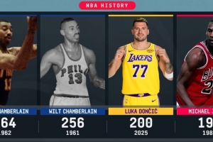 在赛季的前五场比赛中,东契奇合计得到200分,历史第三高,仅次于张伯伦,详情如下: