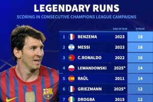 体育资讯11月27日讯 《转会市场》统计了欧冠历史赛季连续进球情况,梅西和本泽马并列居首。
