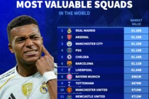 🤑球队身价榜:皇马13.8亿欧力压枪手12.9亿,巴萨第6利物浦第7
