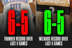 雷霆目前30胜6负,排名西部第一;奇才9胜25负,排名东部第十四。
