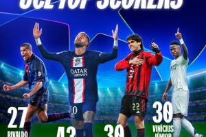 维尼修斯在欧冠中的进球数达到30球,这让他追平了卡卡并列巴西球员欧冠进球榜次席,位居两人身前的是打进43球的内马尔。