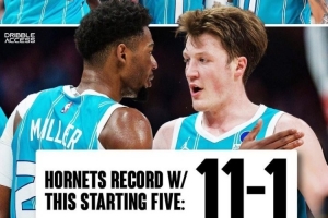 据统计,黄蜂使用拉梅洛·鲍尔、布兰登·米勒、克尼佩尔、布里奇斯、迪亚巴特这套首发的战绩为惊人的11胜1负。